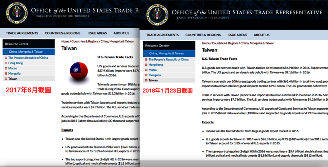 記者張加/華盛頓報導 美國貿易代表署(USTR)官網介紹臺灣頁面,去年仍可見中華民國國旗圖案,現卻消失。圖/截自USTR,記者張加後製